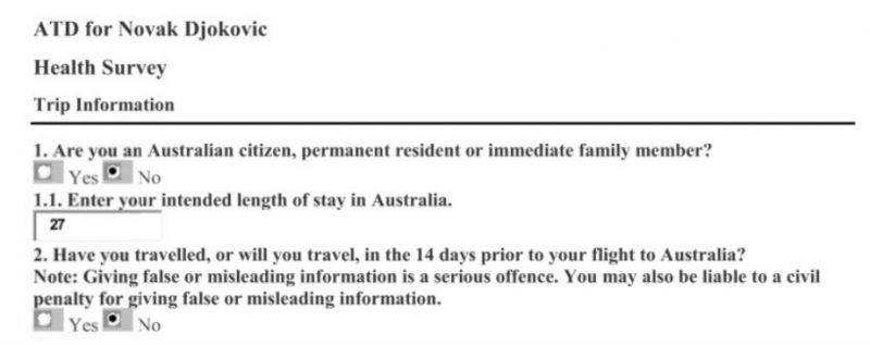 В декларацията за пътуване ясно е посочено, че подаването на невярна информация е сериозно нарушение, което може да доведе до гражданска санкция „с минимално наказание от 12 месеца в затвора“. Според неофициална информация Джокович е обяснил, че декларацията му е попълнена от представител на Австралийската тенис федерация – органът, който заедно с щатските власти във Виктория му осигури медицинско изключение.