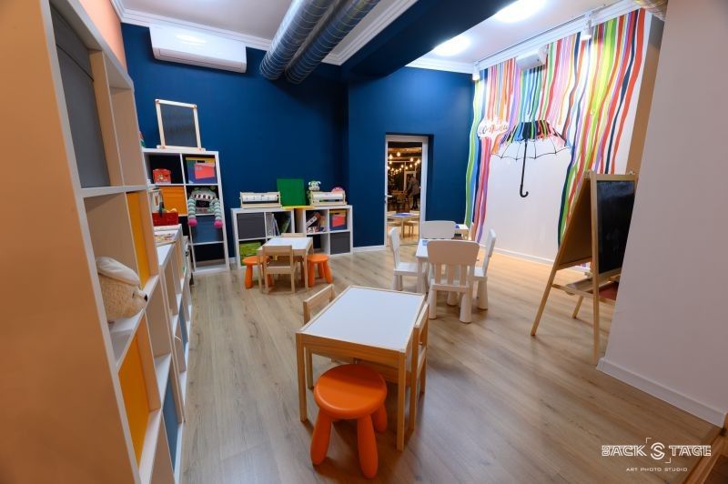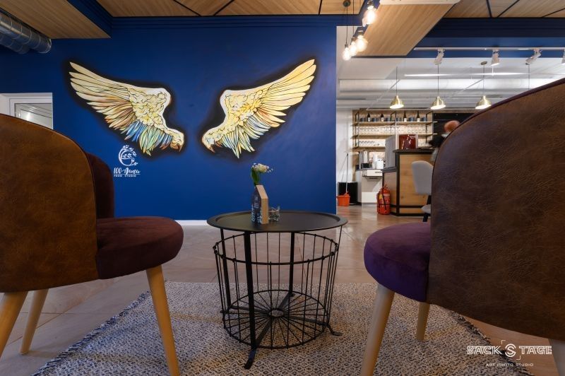 Още отвън, вниманието привлича изисканият и различен от всичко познато интериор - стени изрисувани от сливенски художници със символите на града, бар в индустриален стил и детски кът с игри и занимания за малките посетители.