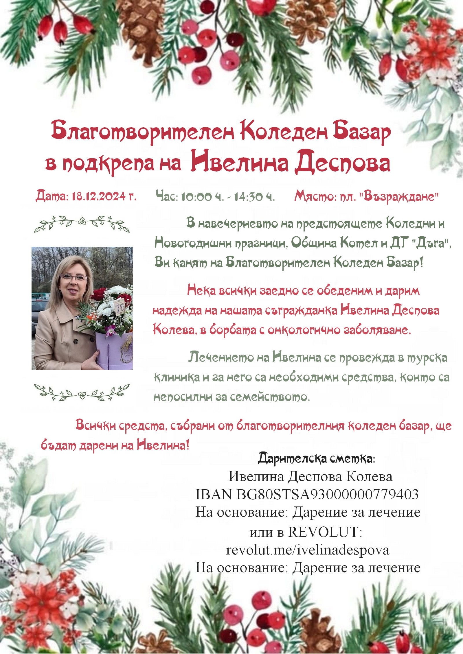 Община Котел и детска градина „Дъга“ организират благотворителен Коледен базар в подкрепа на Ивелина Деспова Колева, която страда, повече от година от онкологично заболяване. Тя е диагностицирана с множество метастази на черен дроб, възпаление на перитонеум и асцит и в момента се лекува в турската клиника “ANADOLU”. За лечението на Ивелина са необходими средства, които са непосилни за семейството.