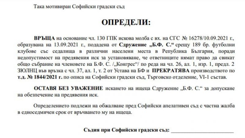 Софийският градски съд (СГС) отхвърли иска на БФС, заведен срещу 189-те футболни клуба, които се подписаха в подписката за свикване на извънреден конгрес. В свое определение (№625) от 13 септември СГС връща исковата молба на БФС, заведена на 10 септември.